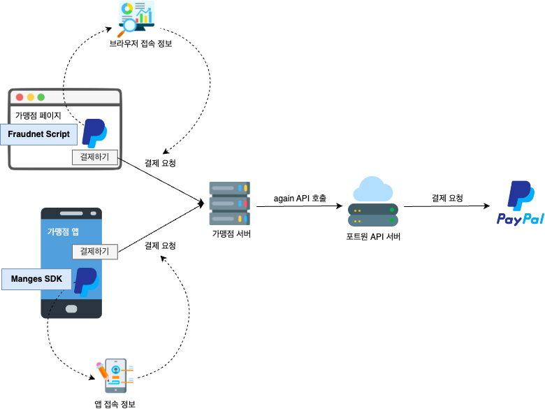 브라우저/앱에 페이팔 Fraudnet Script/Magnes SDK를 추가한 후 again API를 호출할때 진행되는 플로우는 아래와 같습니다.