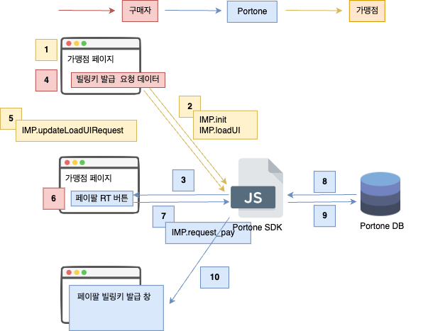 따라서 다른 PG사와 빌링키 발급 플로우가 상이하기 때문에 고객사는 체크아웃 페이지가 렌더링 되는 시점에 IMP.request_pay 함수 대신