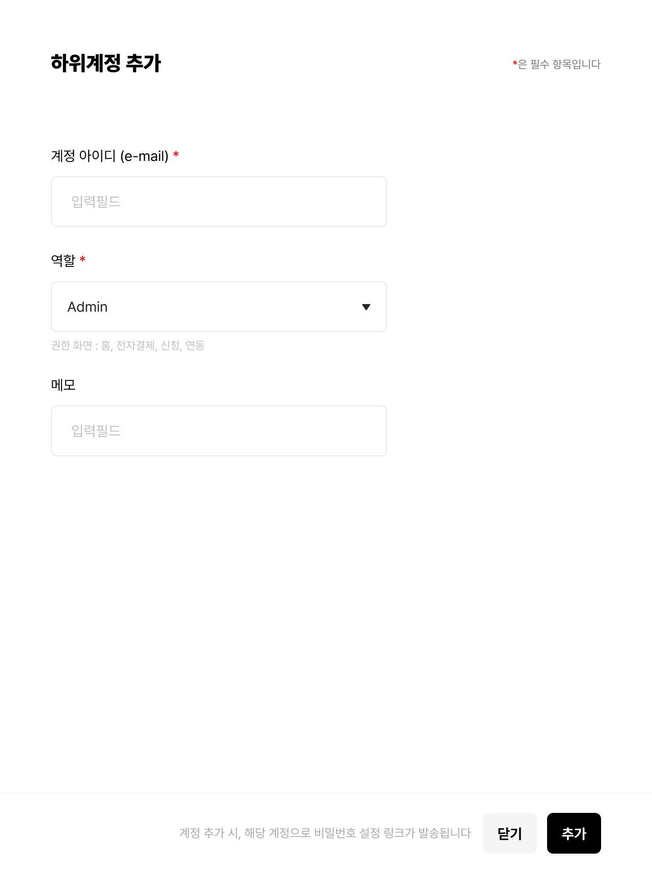 - 계정 아이디, 역할 (Manager, Read Only), 메모를 입력하신 뒤 하위계정을 생성 하실 수 있습니다.