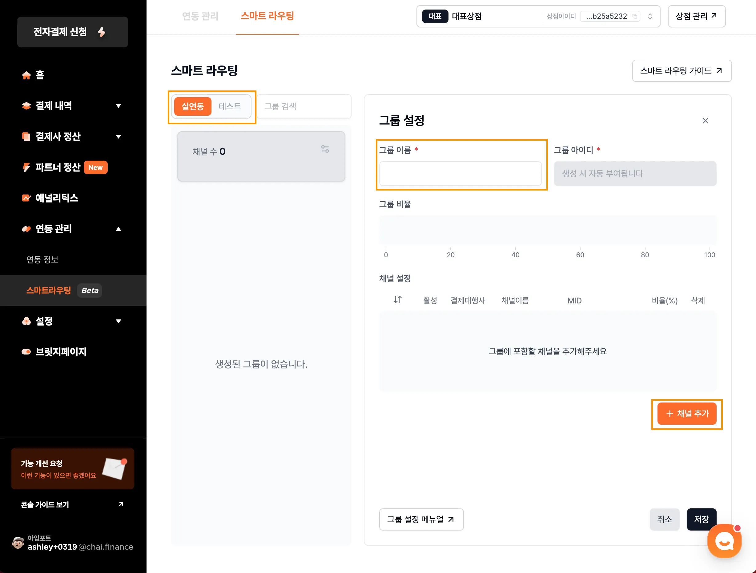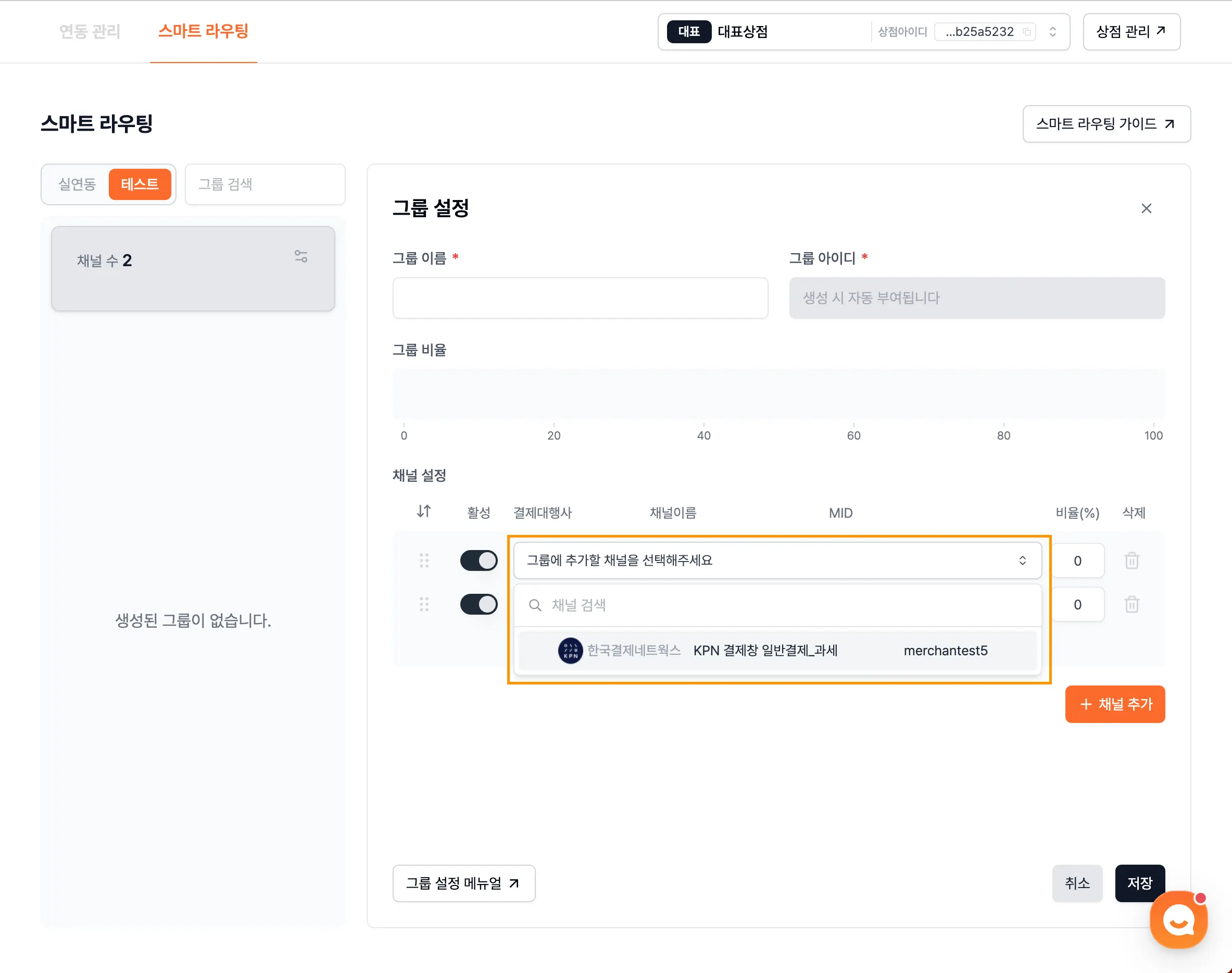 3. 연동할 환경을 선택하세요. [실연동], [테스트] 선택 시 해당 환경으로 등록된 채널만 표시됩니다. 스마트 라우팅 그룹 내에 동일한 환경의 채널끼리만 설정이 가능합니다.