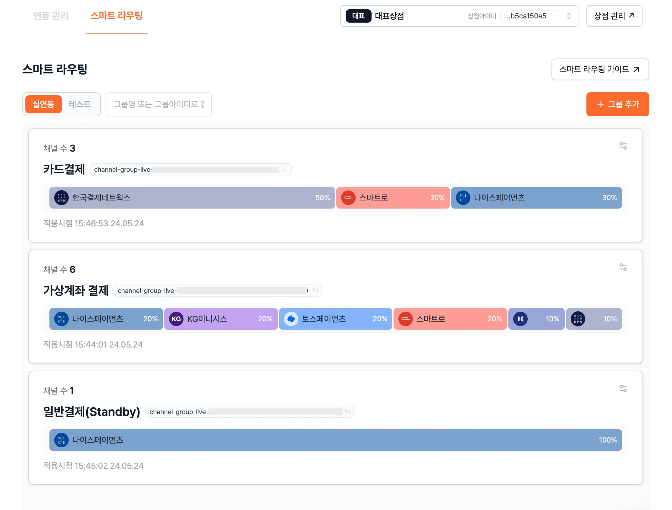 스마트 라우팅을 사용하기 위해서는 포트원 관리자콘솔 내 [연동 관리] - [스마트 라우팅]에서 그룹 설정이 필요합니다.