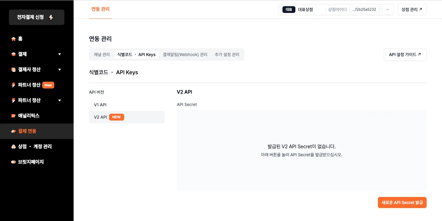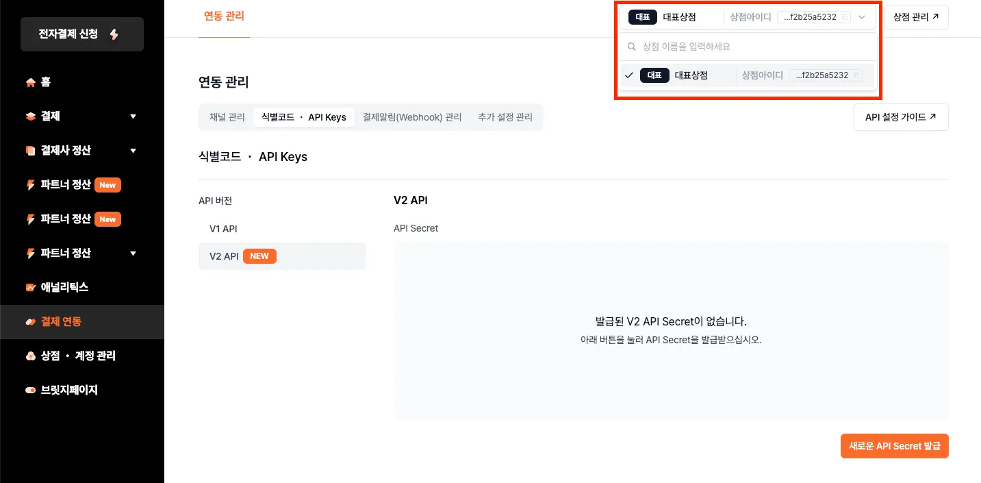 • 관리자 콘솔 화면에서 [결제연동] → [연동 관리] → [식별코드·API Keys] 메뉴에서 [V2 API]를 선택합니다.