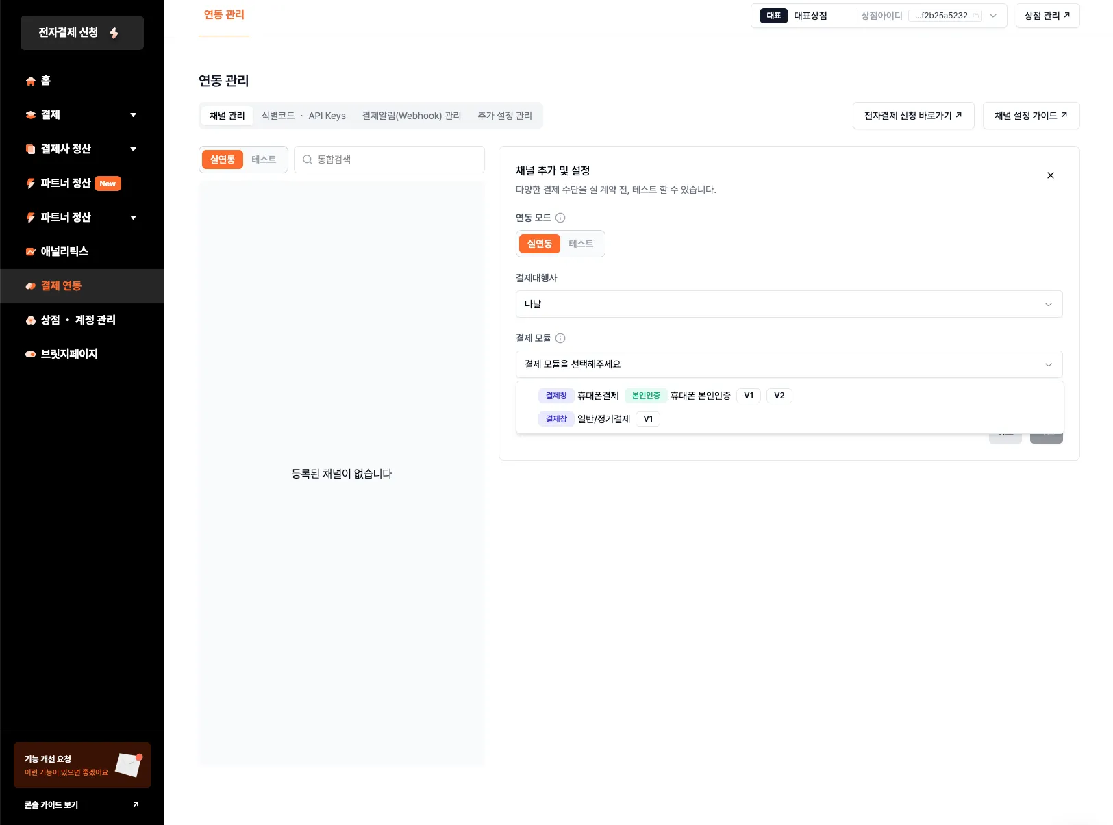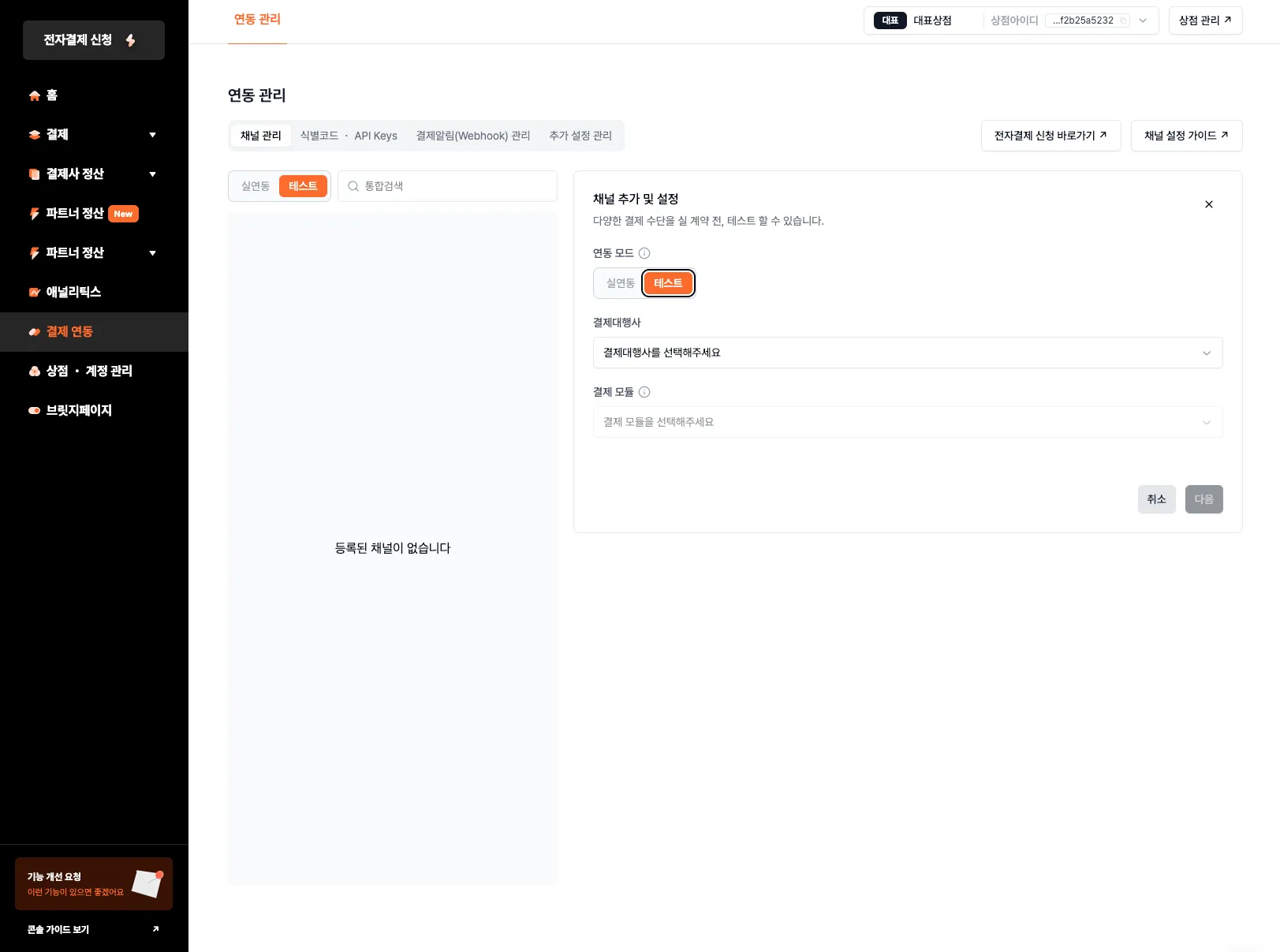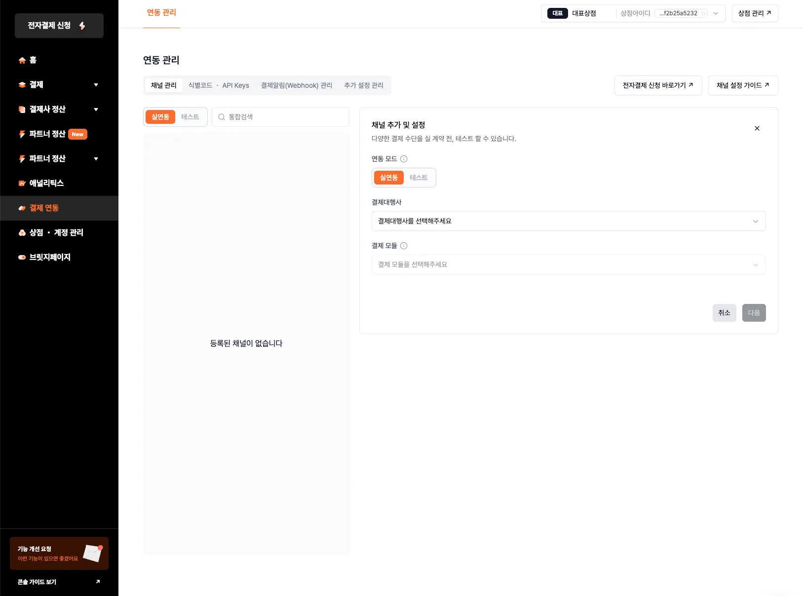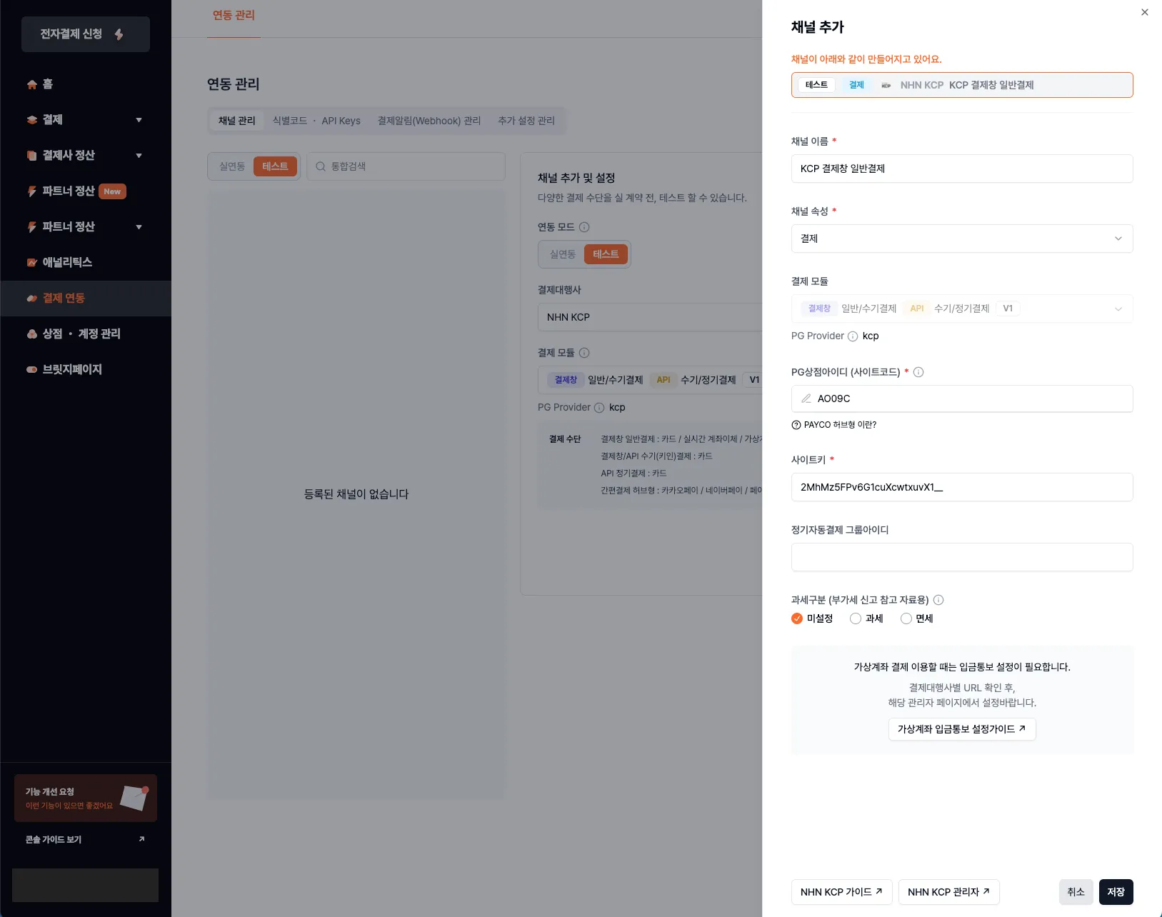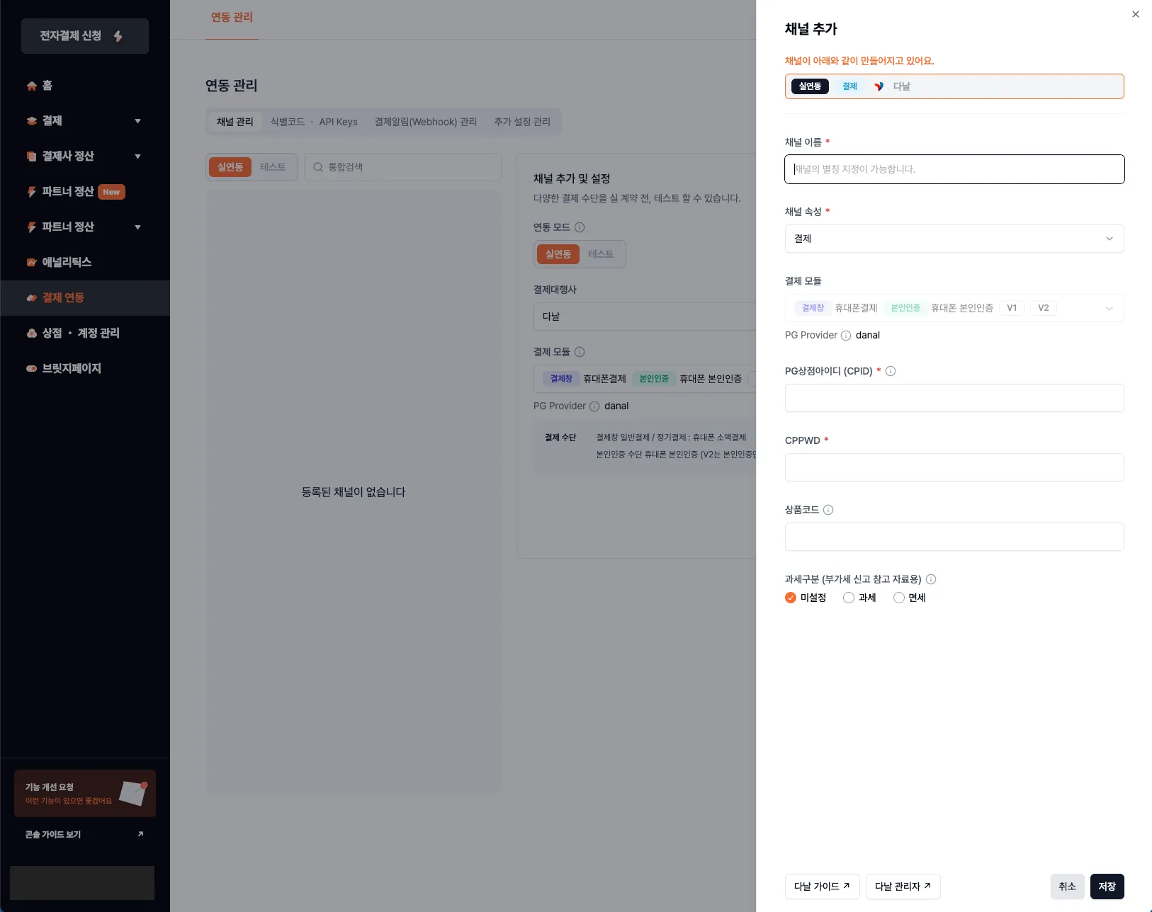 결제 연동 시 사용할 결제대행사 채널을 추가합니다.