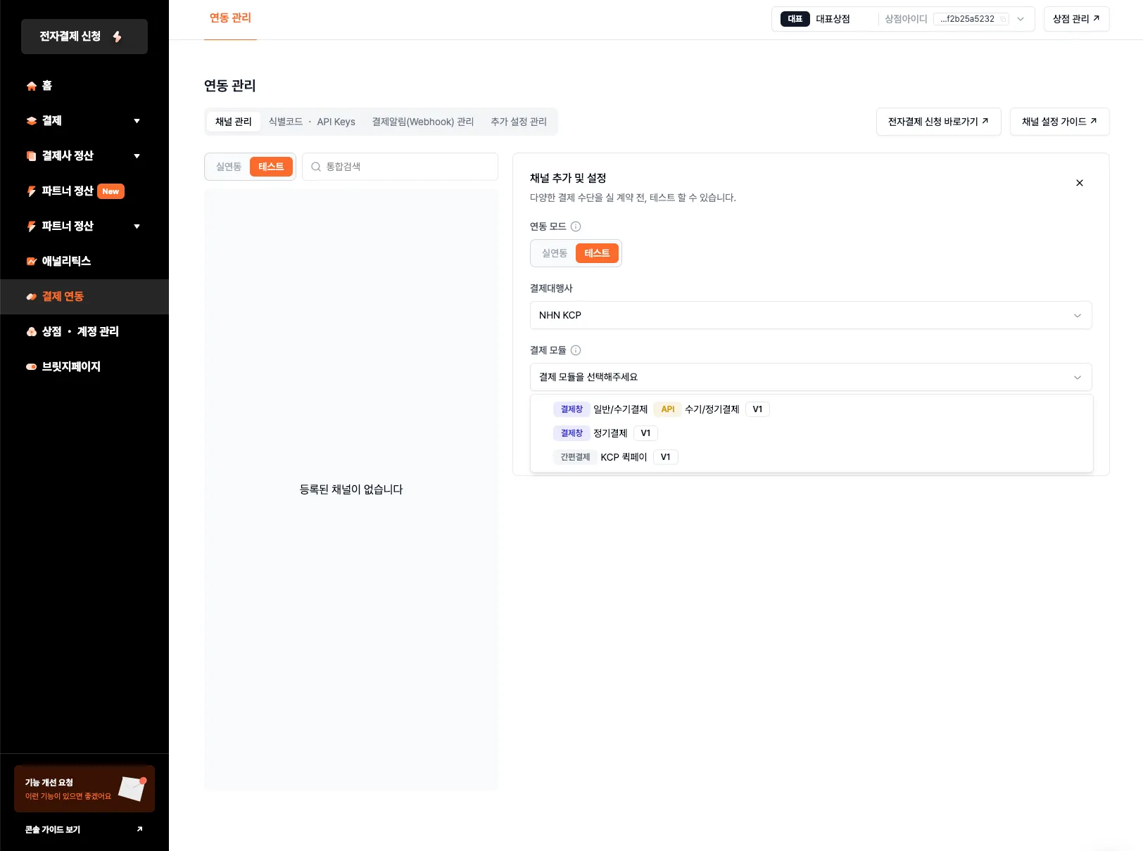 • 관리자 콘솔 화면에서 [결제 연동] → [연동 관리] → [채널 관리] 메뉴에서 연동하고자 하는 결제대행사 및 결제 모듈을 선택하여 채널을 추가합니다.