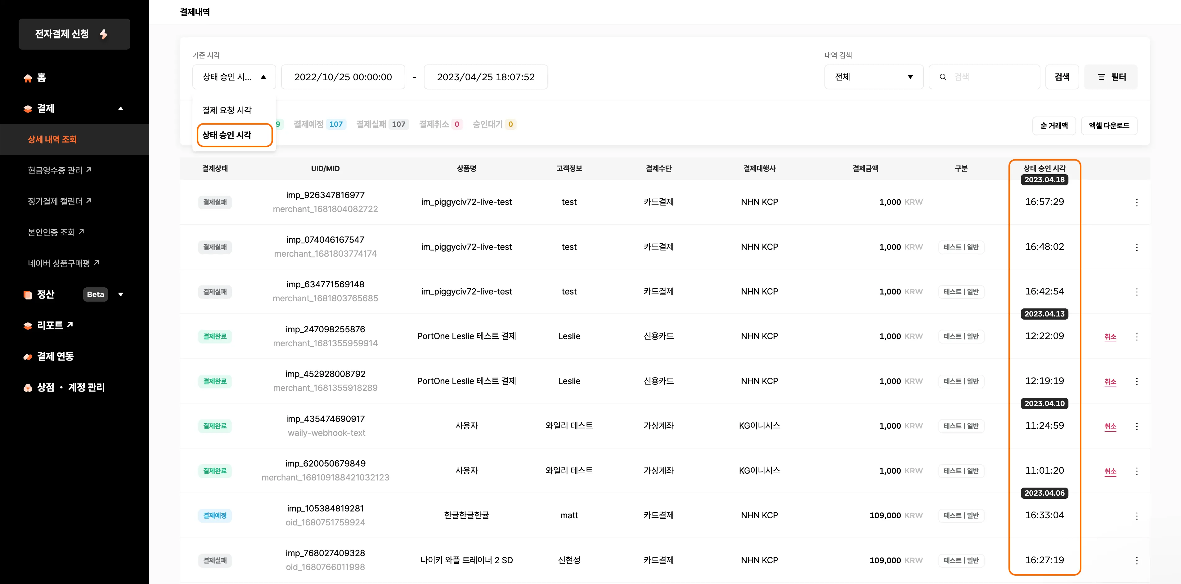앞으로는 결제건의 결제 상태와 더불어 마지막 결제 상태가 업데이트된 시각도 함께 볼 수 있습니다.