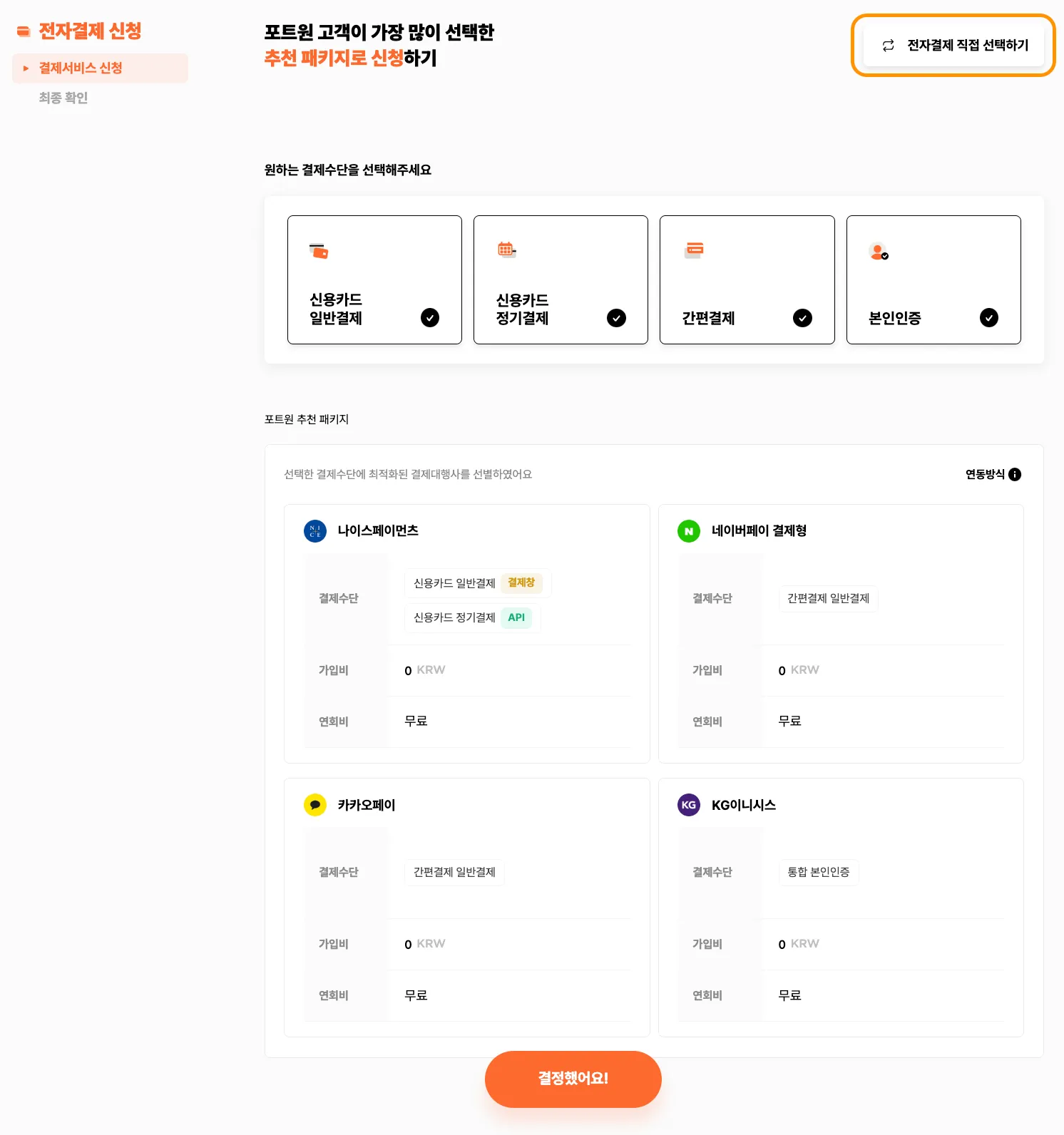 ✔️ 전자결제 신청시 포트원 추천 패키지를 선택할 수 있습니다.