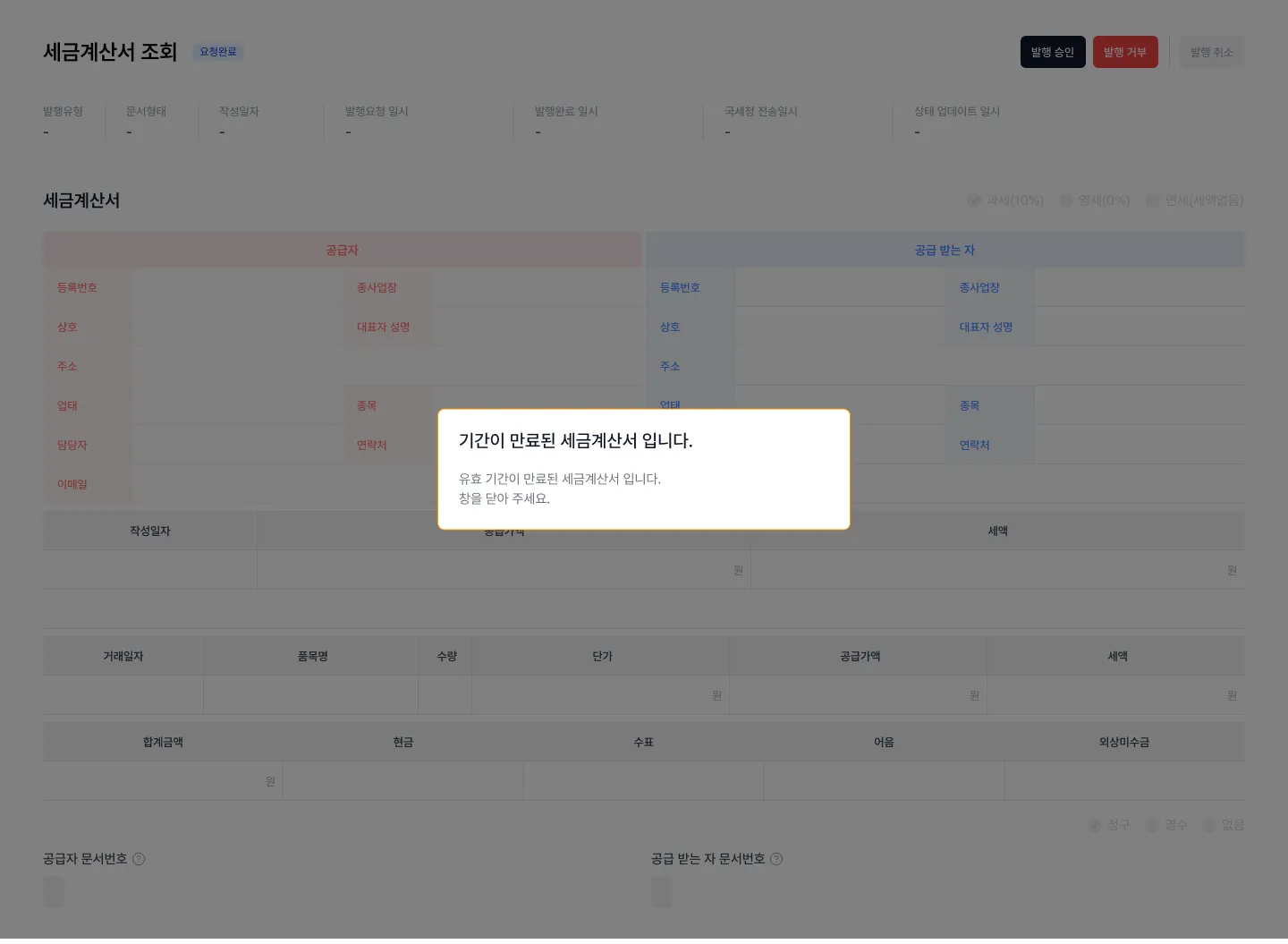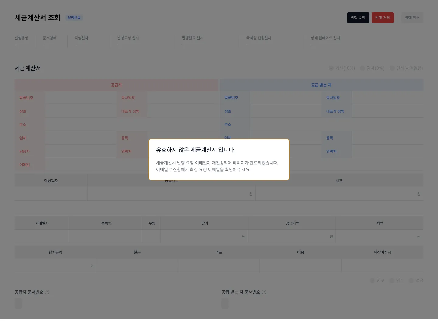 • 토큰이 만료(이메일 발송일로부터 2달 경과)된 세금계산서에 대하여 에러 메시지를 노출합니다.