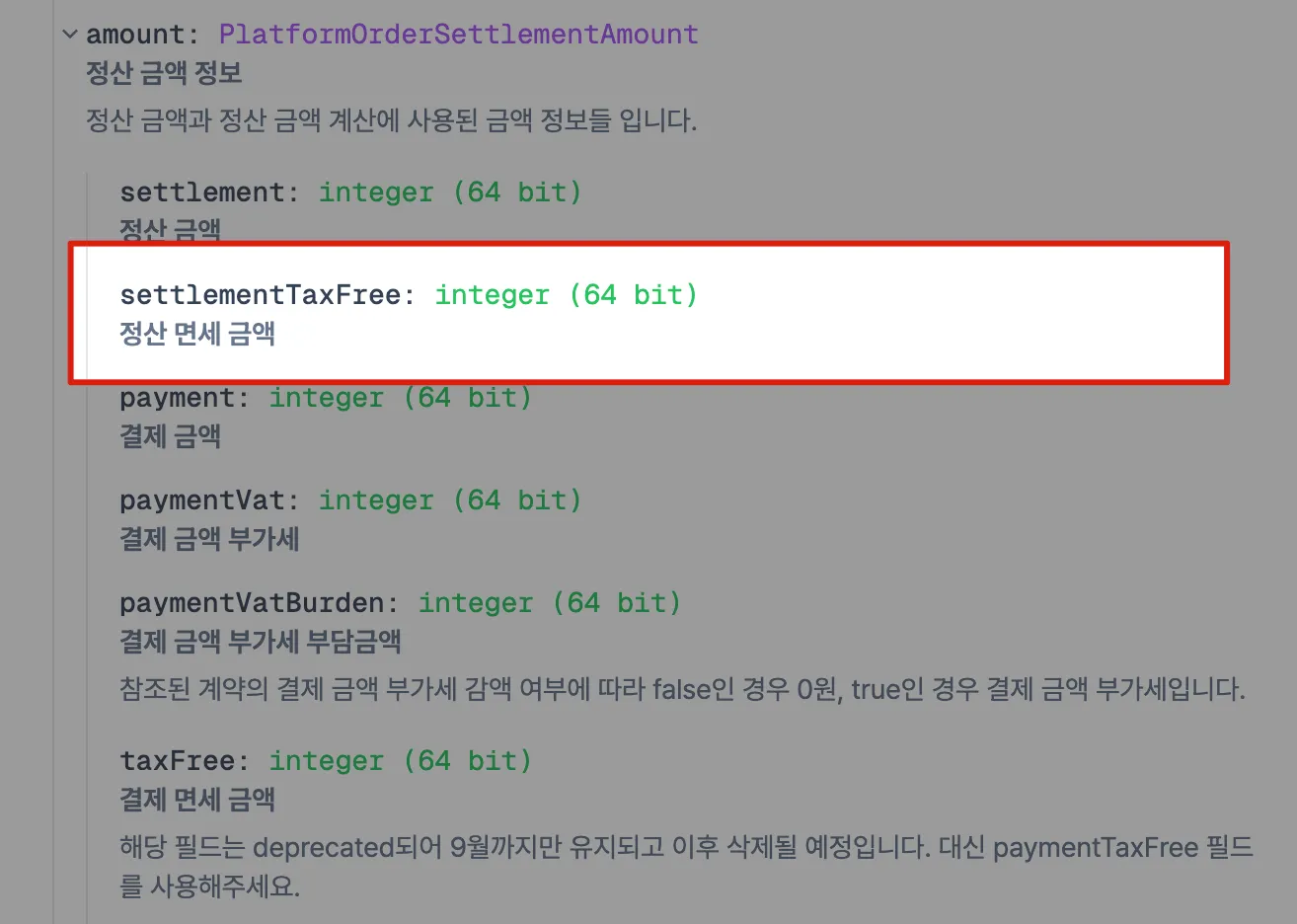 해당 컬럼들은 paymentTaxFree / paymentSupply 로 대체하여 활용가능하니 참고 부탁드립니다.